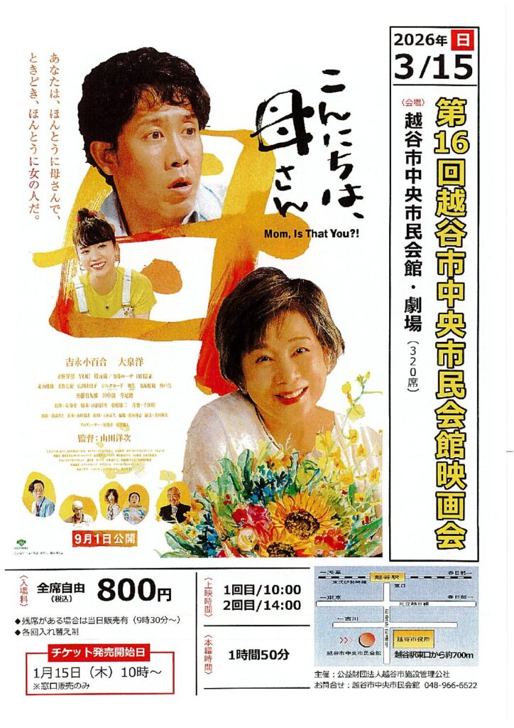 第16回越谷市中央市民会館映画会 更新日:2025.12.28 映画会 〇第16回越谷市中央市民会館映画会 ・日 時:令和8年3月15日(日) ・会 場:越谷市中央市民会館 1階劇場 ・上映時間:1回目 10時~ 2回目14時~ ・上映作品:「こんにちは、母さん」 (吉永小百合、大泉洋他、山田洋二監督) ・上映時間:110分 ・前売販売:令和8年1月15日(木)から ・販売場所:越谷市中央市民会館、サンシティホール ・入 場 料:1人800円(全席自由) 開催日 2026年3月15日(日) チラシ表面 チラシ裏面